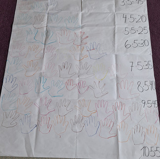 Die Malreihen wurden auf spielerischer Weise gemeinsam Erarbeitet. Wir haben beispielsweise beim Erlernen der 2er Reihe immer 2 Paar Socken aufgehängt, haben zum besseren Verständnis der 5er Reihe Händeabdrücke auf ein Plakat gezeichnet, haben Muggelsteine in 10er Eierkartons einsortiert und Spielzeugautos mit ihren 4 Reifen aufgelegt.
